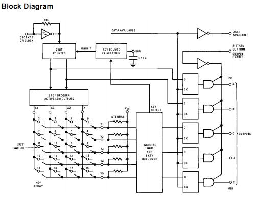 The 74C923 is a key encoder providing all the necessary logic to fully encode an array of SPST switches. The keyboard scan can be implemented by either an external clock or external capacitor. The 74C923 has on-chip pull-up devices which permits switches with up to 50 kΩ on resistance to be used. No diodes in the switch array are needed to eliminate ghost switches. The internal debounce circuit of the 74C923 needs only a single external capacitor and can be defeated by omitting the capacitor.