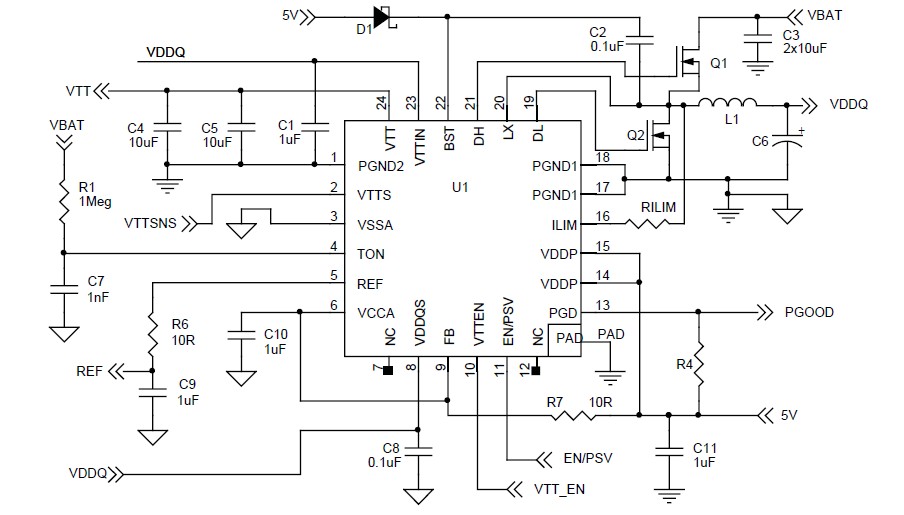 The SC488MLTRT is a combination switching regulator and linear source/sink regulator intended for DDR1/2 memory systems. The purpose of the switching regulator SC488MLTRT is to generate the supply voltage, VDDQ, for the memory system. It is a pseudo-fixed frequency constant on-time controller designed for high effi ciency, superior DC accuracy, and fast transient response. The purpose of the linear source/sink regulator is to generate the memory termination voltage, VTT, with the ability to source and sink 2.8A peak currents.